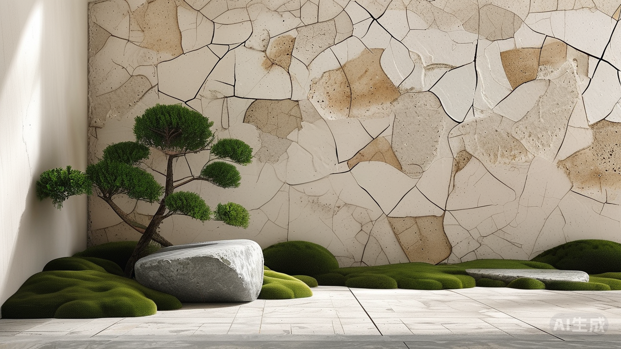 侘寂的髓,则深植于手工的呼吸与残缺的禅意中。当手塑感极强的陶土砖覆上墙壁,那泥土的暖意与纹理的微妙起伏,便不再是冰冷的覆盖,而是泥土般温厚的包裹。墙面那看似随意嵌上的几片不规则裂釉砖,其缝隙恰如枯山水中的留白,予人凝思空间。地面则宜选低饱和度的素色砖,米白、浅灰或烟粉,表面带着细微如呼吸的凹凸,赤足踏过,足下仿佛轻触旧时光晕染出的温存痕迹。砖缝间漫不经心嵌入的苔藓绿意,或是自然延伸的木质元素,便为这寂然之境悄然注入几缕生机。